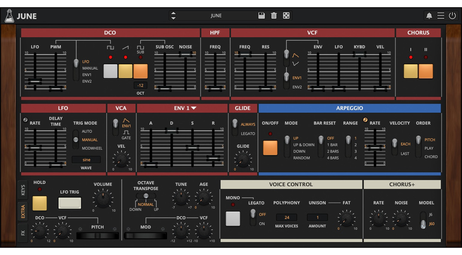 June starts with the synthesis architecture of the original, including the DCO with sub oscillator, non-resonant highpass and 24dB/Oct resonant lowpass filters, two envelopes, LFO, and famous chorus with all three modes (I, II, I+II).