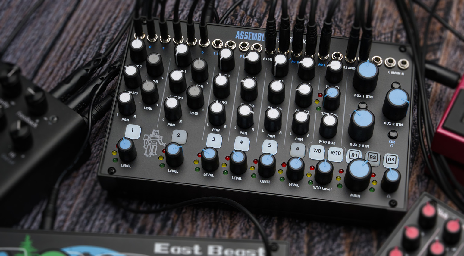 In addition to the stereo main output, there’s an independently controllable cue or headphone output. Compatible with line and Eurorack levels, the mixer can be added directly to a Eurorack system if desired. All connections are mini jacks, making the Assembler perfect for setups with modular gear and small desktop synths (such as the manufacturer’s East Beast, West Pest, and Boom Chick) and modular gear, but less ideal for gear with 1/4” outputs.