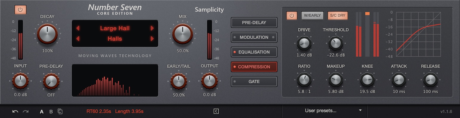 With Seventh Heaven, you get all the original presets (236 total) from the M7 hardware, including those from the v1 and v2 firmware updates, as well as the non-linear reverb algorithms. Without a doubt, one of the most impressive features is the 5-band EQ section that allows you to process decay times according to the frequency range.