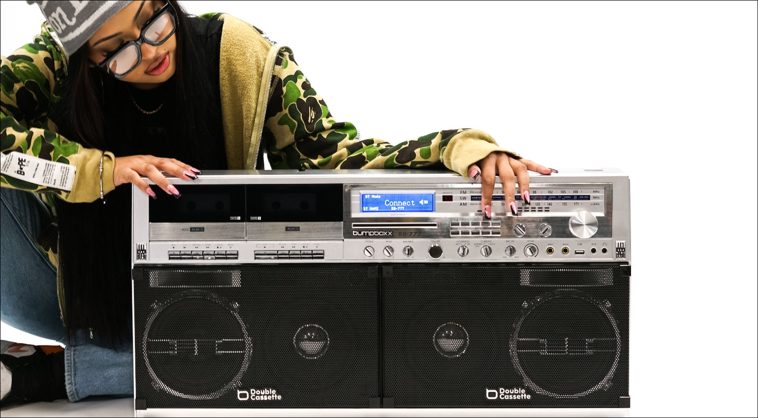 The Bumpboxx BB-777 revives the gold standard boombox of the 1980s, the Sharp GF-777, but updates it with Bluetooth, USB playback, and a rechargeable battery.