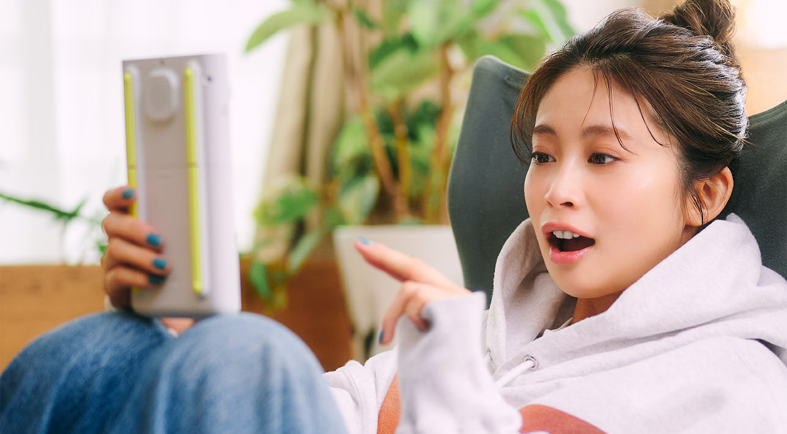 Casio is hyping the portability of the device with a target weight of 315 grams. “Perfect in your hands, on a desk, on the couch, and on the go,” the sign says.