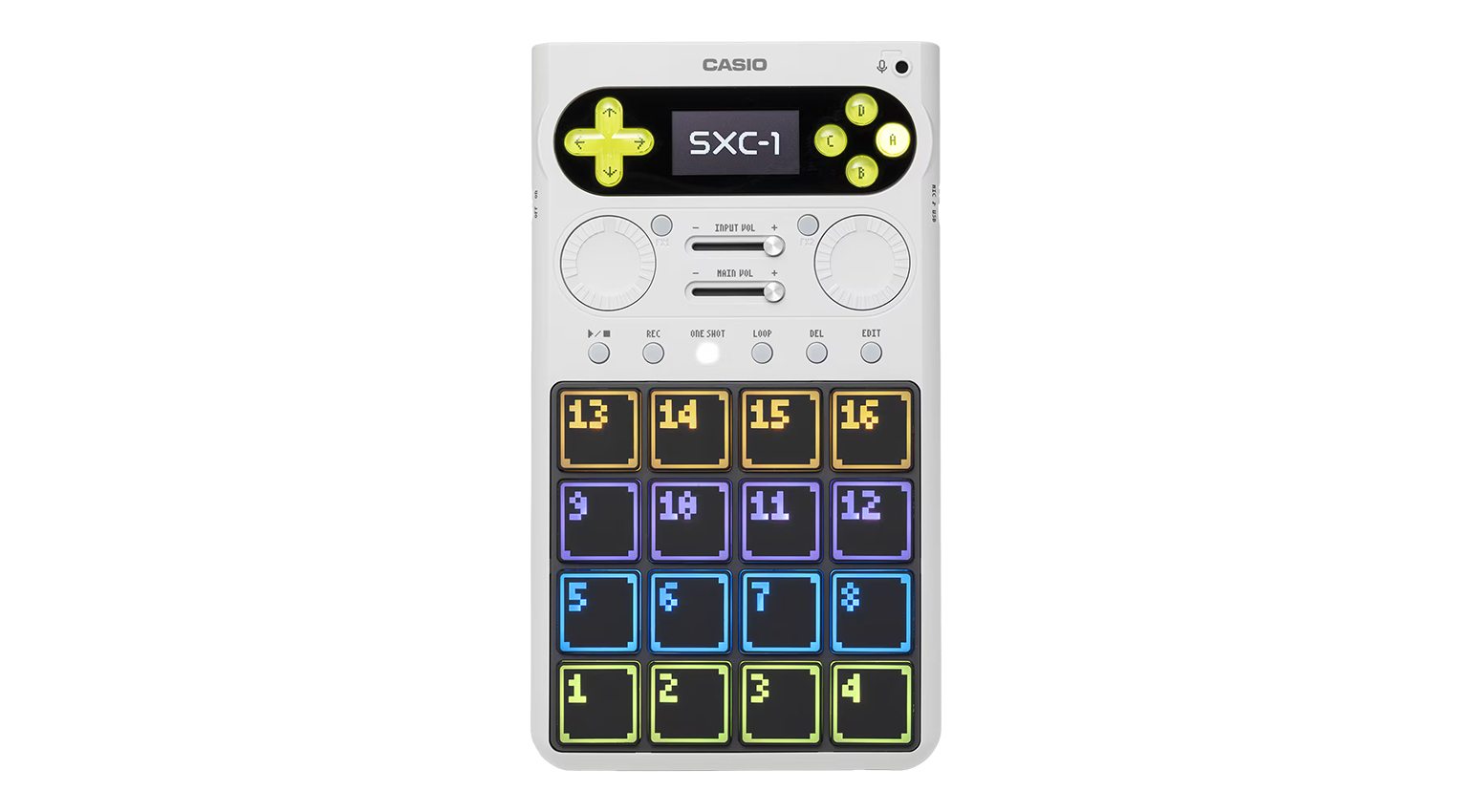 So, the sampler (now officially called SXC-1) is a portable, standalone sampler with a built-in mic and speaker. It’s got 16 pads arranged in a 4×4 pattern like an SP, with large, Casio-style calculator numbers emblazoned on them. It’s got 10 banks of samples with 16 per bank (TBD) that you access by pressing the PlayStation controller buttons and D-pad. There’s also a sequencer, with an onscreen grid that’s giving me strong TR-707 vibes. That screen, by the way, is a 1.3-inch OLED display.