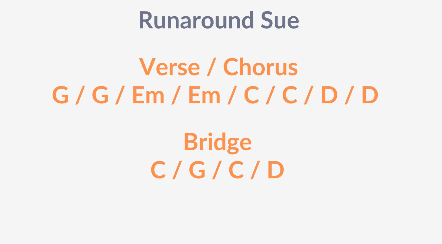 What should you watch out for when learning Runaround Sue? Just be mindful that in the verse and chorus sections, we play two bars on each chord, instead of one. This translates to 8 beats on each chord. However, it switches to just one bar each in the bridge.