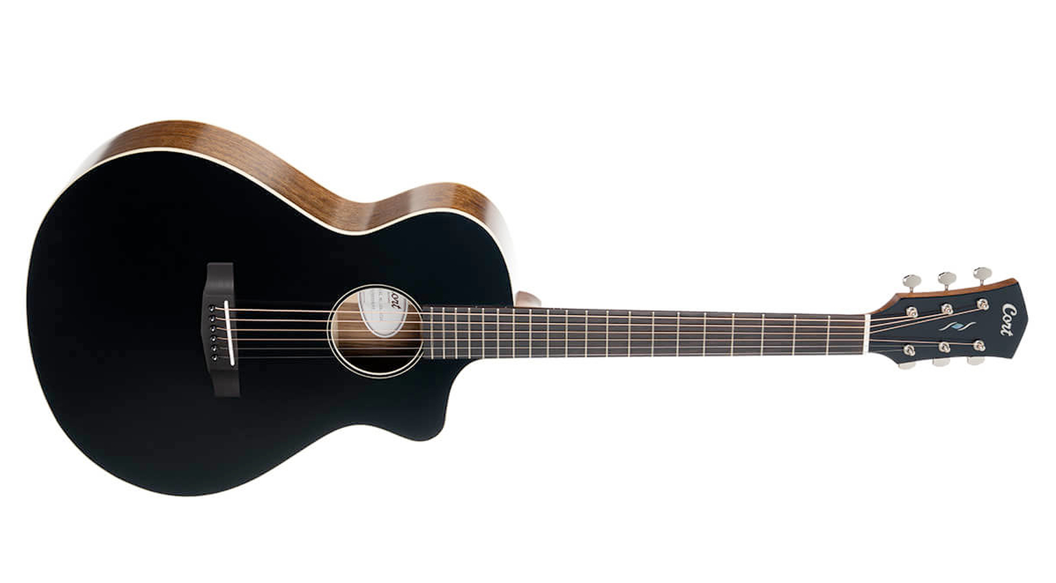 The back and sides of this model are also made of Ovangkol in addition to a spruce X-bracing. As with the Cort Gold MC6, this model’s neck is made of mahogany, while the fretboard is rosewood to color-match the finish. Cort has not added as many embellishments to this model; a simple white binding adorns the body and rosette, which complements the minimalist look.