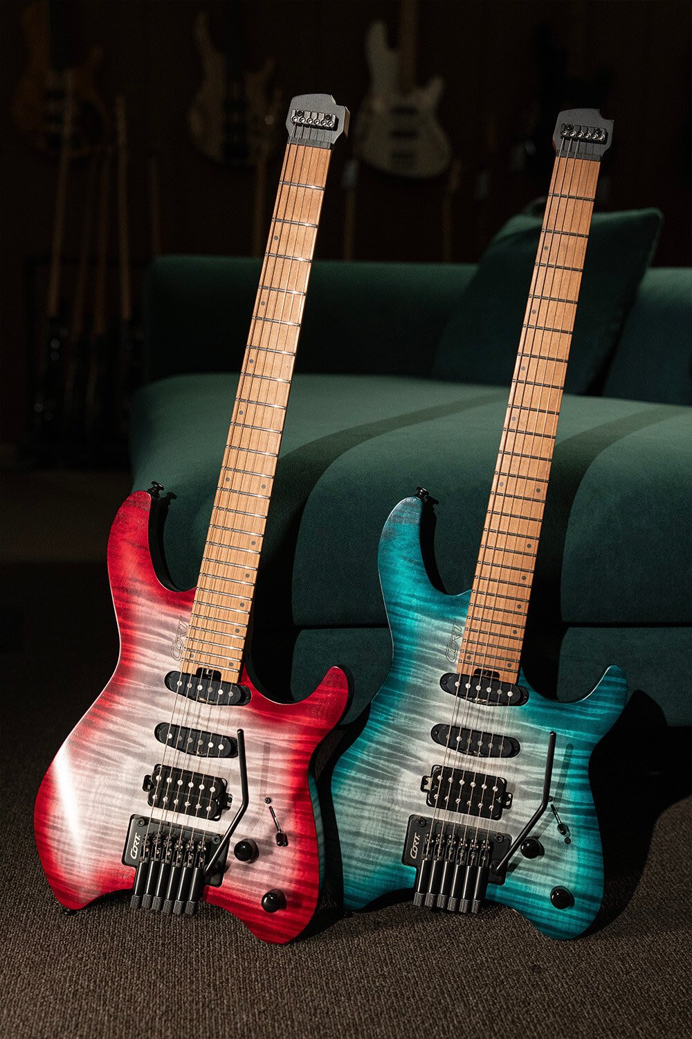 This new Cort Space G6TR model is available in Semi-Gloss Lava and Semi-Gloss Lagoon finishes applied to an okoume body with a flamed maple veneer top. This makes them stand out nicely against the crowd, and, as they are headless guitars, they really do demand attention, as they visually look like actual axes.