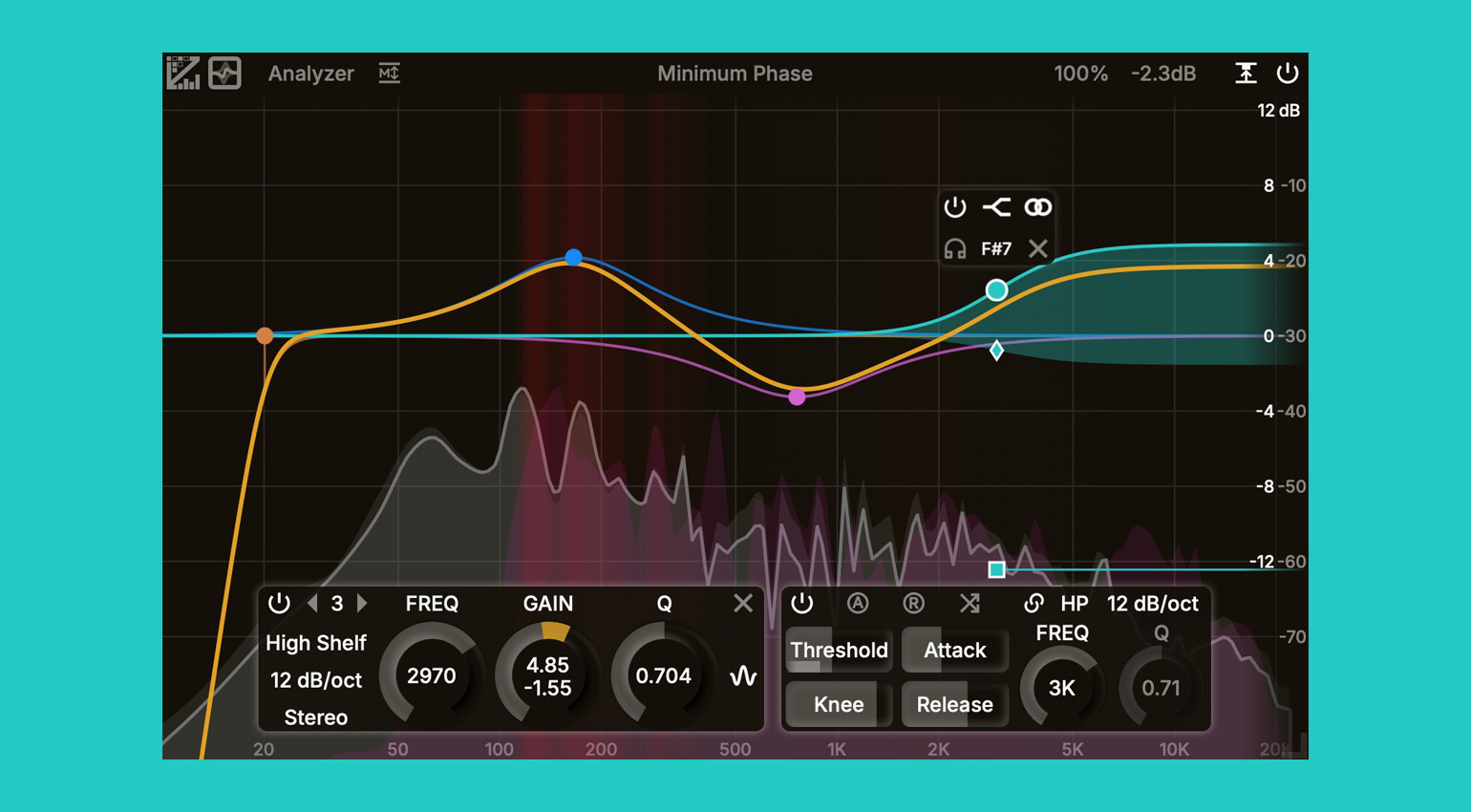 Offering 64-bit floating point processing, six filter structures, and up to 24 frequency bands, each with a choice of eight filter types, this is a seriously capable EQ! Each band also provides full dynamic control with Threshold, Knee, Attack, and Release sliders and precise sidechain filtering. Five stereo modes (Stereo, Left, Right, Mid, and Side) are available per band.