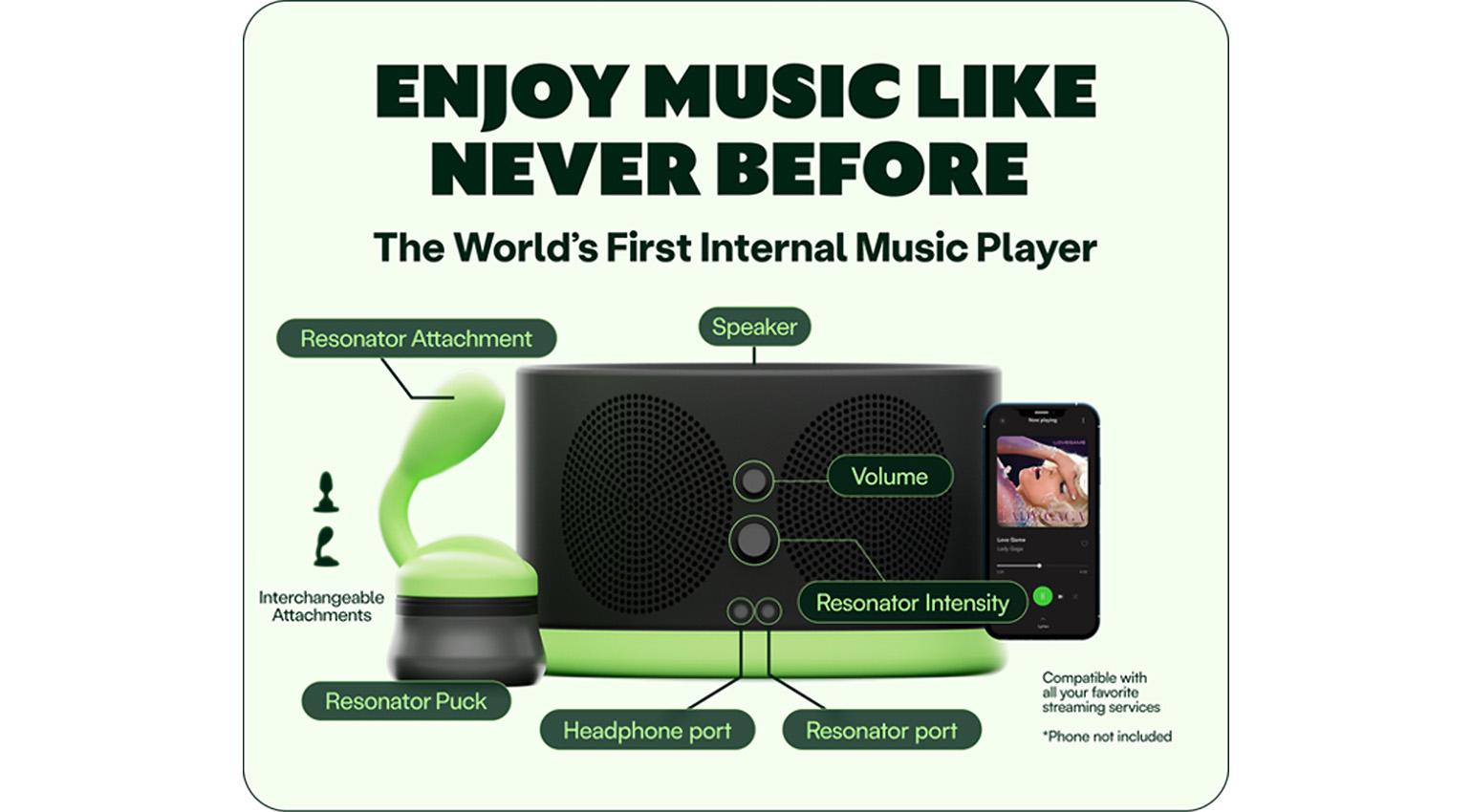 So what is it? The company calls it the world’s first internal music player. You get a Bluetooth speaker that also houses the special resonator controls, which get transmitted wirelessly to a resonator puck. To this puck you attach the resonator shape, and it’s this part that goes inside your body (or outside if you prefer). There are three shapes for both men and women, with more coming in the future. There’s also an optional adapter for attaching your own toys.