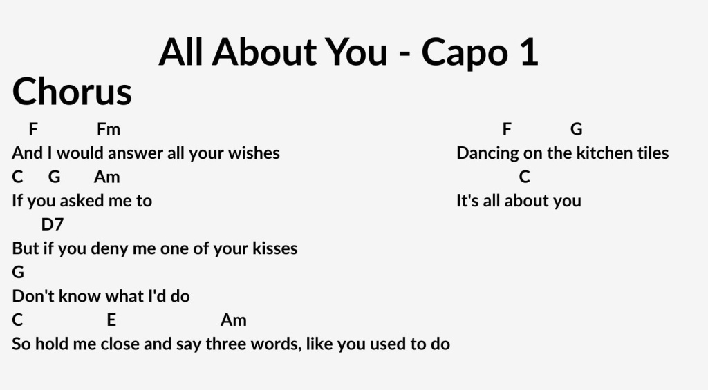 Furthermore, this is a great song to improve your rhythm playing. If barre chords aren’t your thing yet, you can easily play the verse and chorus chords with the capo on the 2nd fret. Two for the price of one, you won’t complain at that!