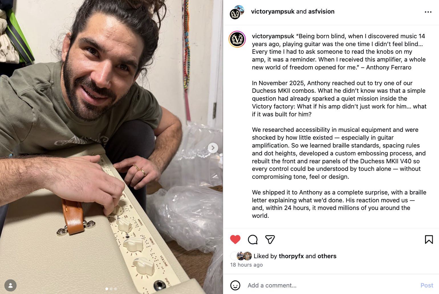 A fantastic gesture, which also raises awareness and helps push inclusivity in our world of music and creativity. Nice one, Victory Amps!
