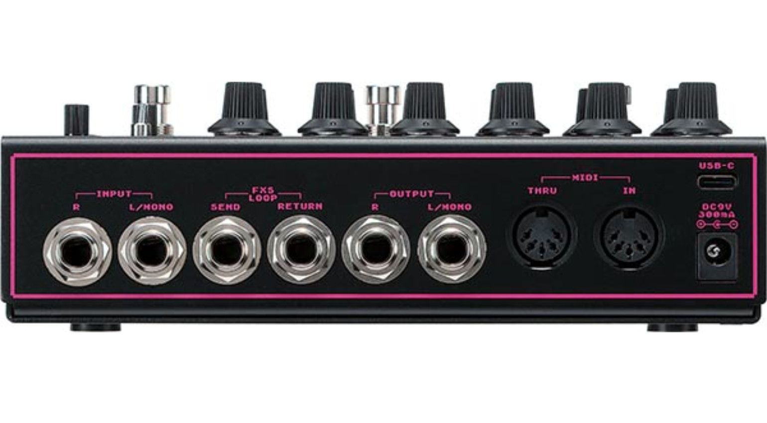 Speaking of presets: a total of 50 can be stored on the Layer Delayer, and 20 come preloaded. These can be accessed and changed via MIDI. On the rear panel, there is a 5-pin MIDI In (plus a MIDI Thru) or, optionally, a USB-C input for MIDI connections. For signal flow, there are two connections each for input and output, as well as a mono FX loop for inserting additional effects into the feedback loop.