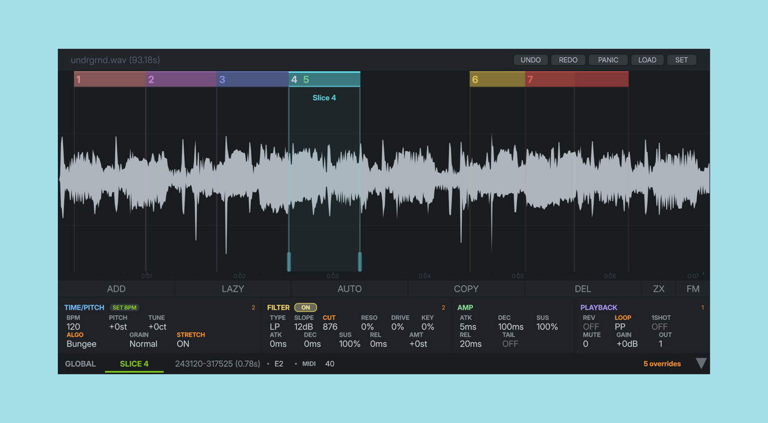 For playback, INTERSECT offers multiple time/pitch algorithms, so you can freely adjust the tuning and/or tempo of slices. There’s also a resonant filter with pre-filter drive, as well as an amp envelope. Slices can also be assigned to mute groups.