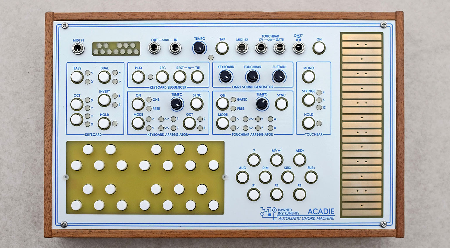 Acadie does away with the teardrop shape of the Omnichord, although it does act like Suzuki’s instrument in other ways. A polyphonic synth and MIDI controller, it gives you a chord button section, a bass sound, plus a touchbar for generating magical, Omnichord-like strums. There’s a sequencer, plus two arpeggiators and MIDI out via USB or TRS Type A. It takes power via USB-C or a 9V adapter. If you’d rather have it in your Eurorack rig, you can take it out of the case and mount it in your skiff.