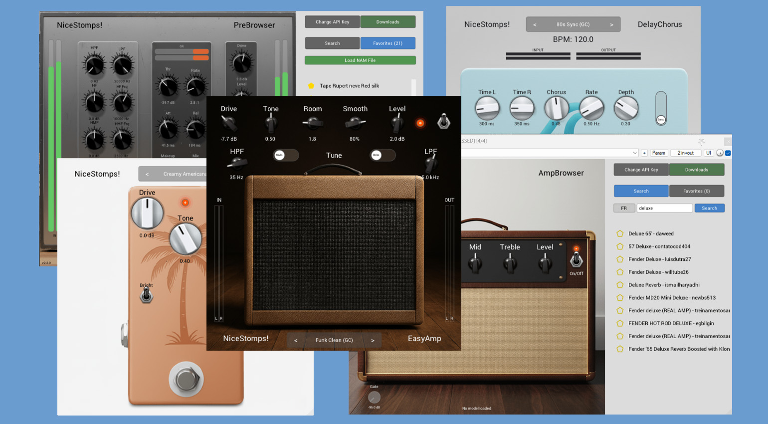 Nice Stomps! by Gianni Chiarello is a collection of essential guitar tools based on the Neural Amp Modeler (NAM) technology. At this time, the bundle includes six plugins: