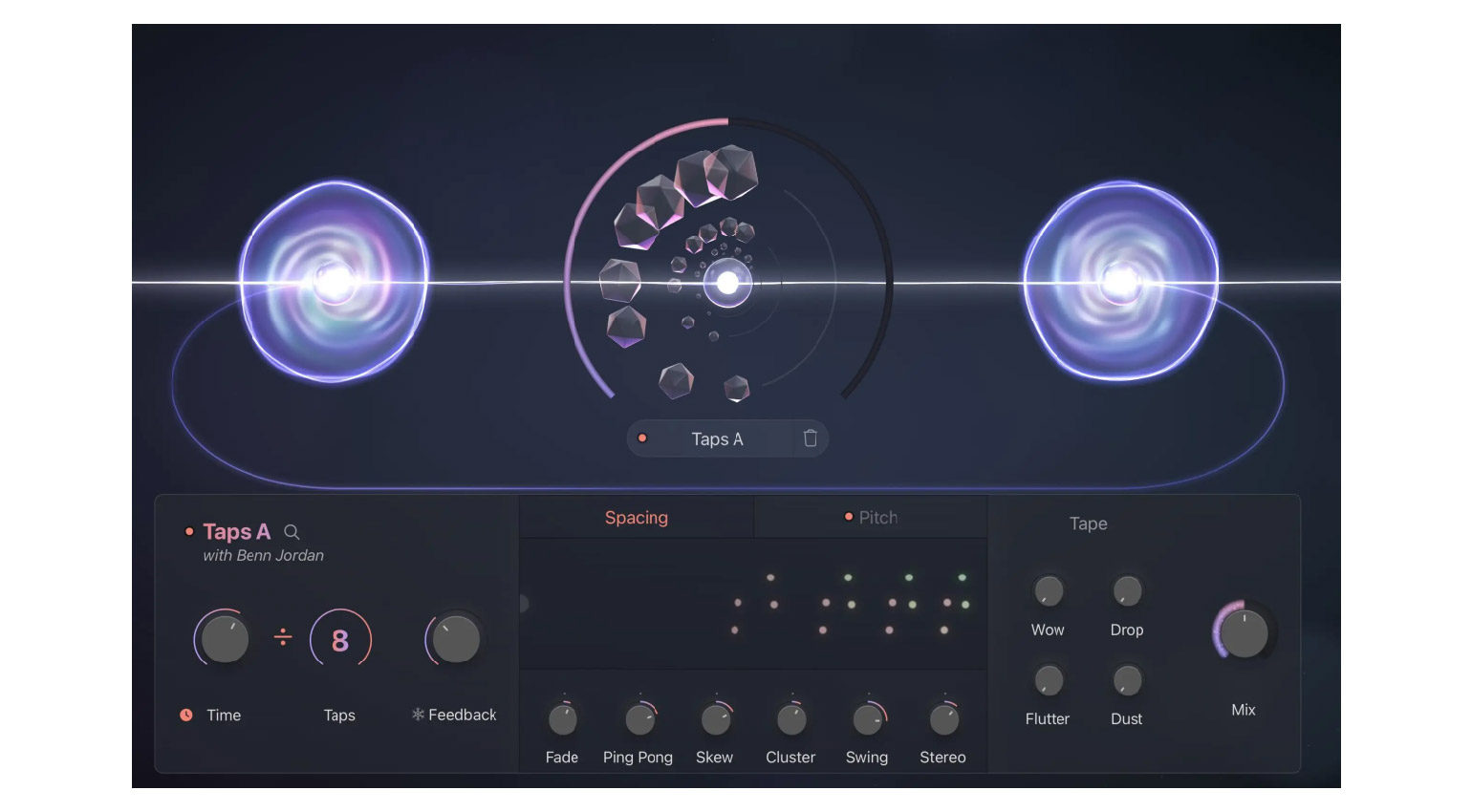 The main control section has two tabs, including the Spacing tab with Fade, PingPong, Skew, Cluster, Swing, and Stereo controls for adjusting the behaviour of the taps. Meanwhile, the Pitch tab gives you access to five different modes to build complex melodic patterns with distinctive timbres. Also, the Tape section lets you dial in the analogue goodness from classic echo effects.