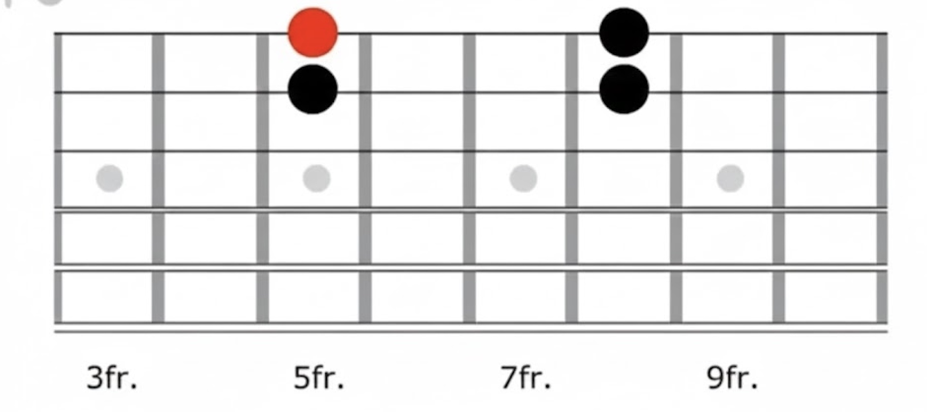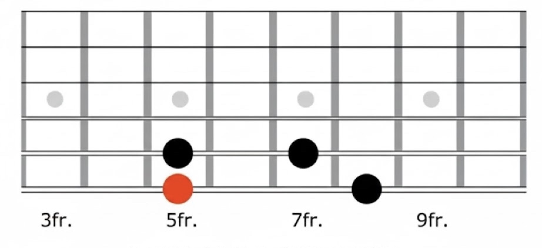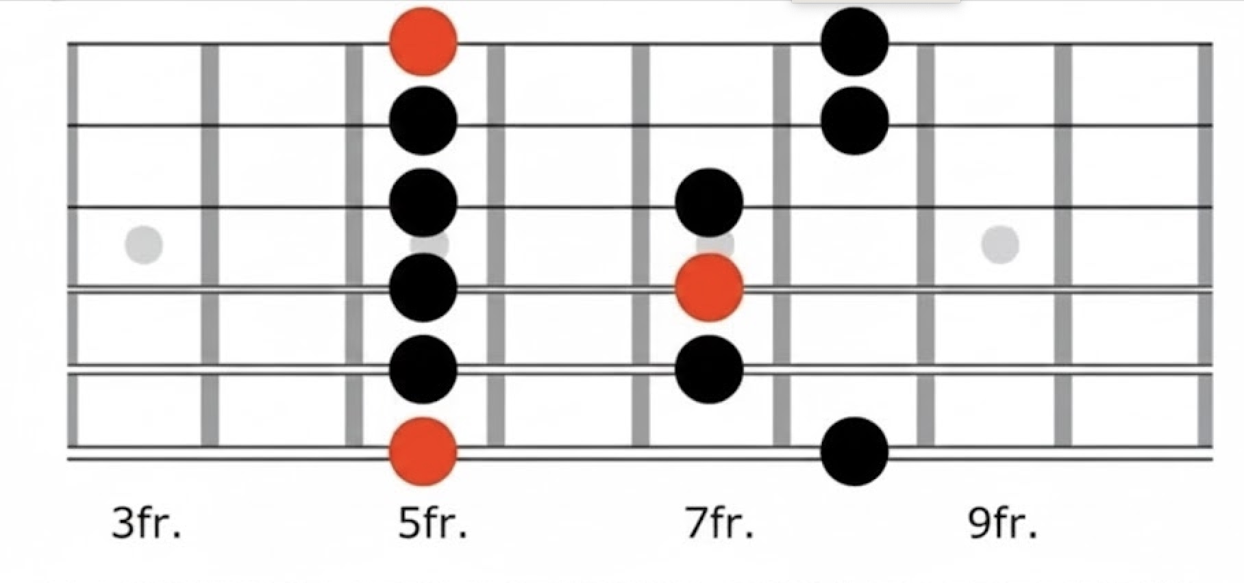 In the A Minor Pentatonic, your Root Notes (A) are the foundation of your sound. They act as “home.” In the shape we just learned, you can find the root notes (marked red in my diagram) at the 5th fret of the Low E, the 7th fret of the D string, and the 5th fret of the High E.