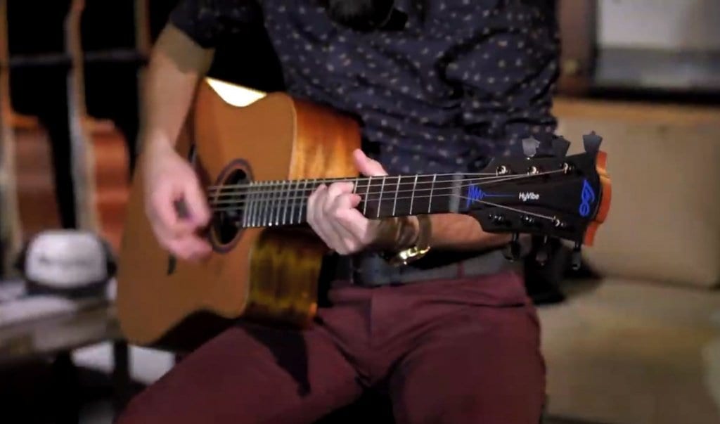 These new Tramontane HyVibe series (THV) by French makers Lâg Guitars under the care of luthier Maurice Dupont and HyVibe were designed using a vibration control system developed by HyVibe. The HyVibe audio company has made a technology that can amplify your acoustic, add effects to it, loop and share your sound to a Bluetooth enabled device, such as an iPhone. The effects include currently reverb, chorus, echo, distortion and a pitch shifter, though Lâg is aiming to add more further down the line.