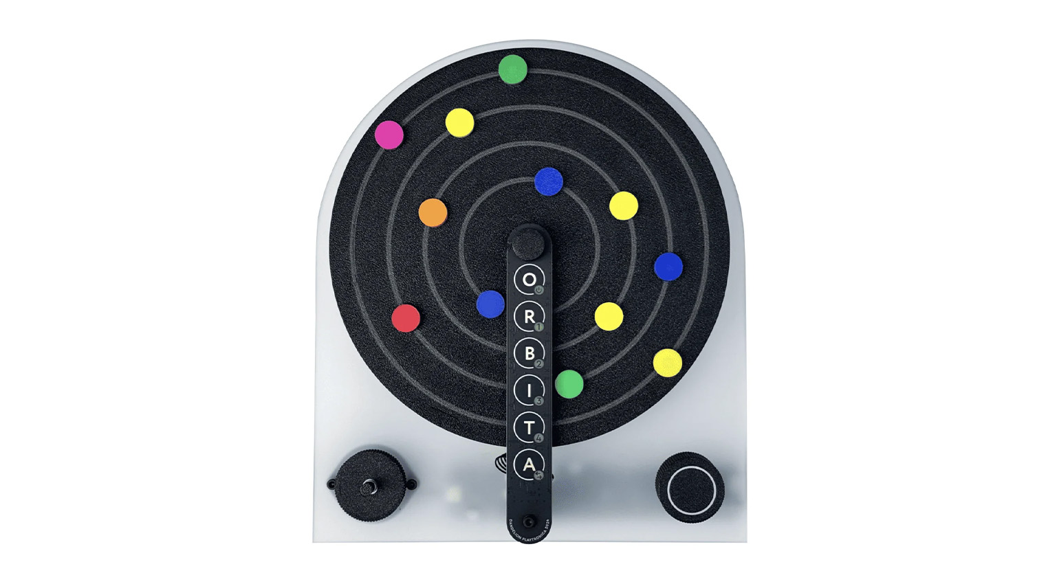 Playtronica are all about the physical interaction. They enjoy nothing more than connecting humans to electronics in order to invoke musical happenings. Whether it’s the TouchMe two-person tactile synth or the Playtron bewilderment tool that turns vegetables into musical triggers, the fun is in the connection. With Orbita the interaction is in the placement of dots upon a turntable of events that are then translated into music.