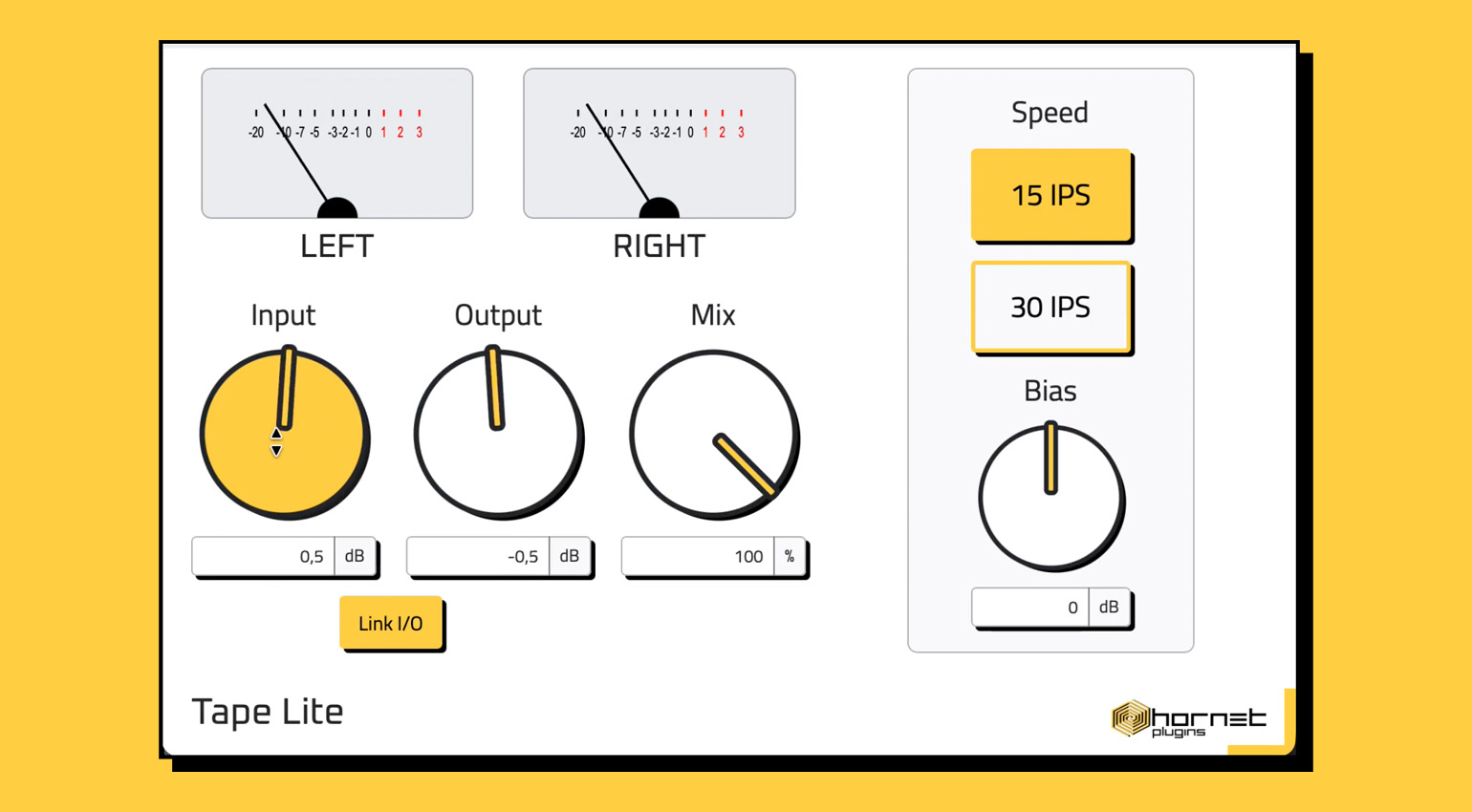 In addition to Input, Output, and Mix knobs (with a link feature), HoRNet TapeLite offers a choice of two tape speeds (15/30 IPS). The bias is also adjustable.