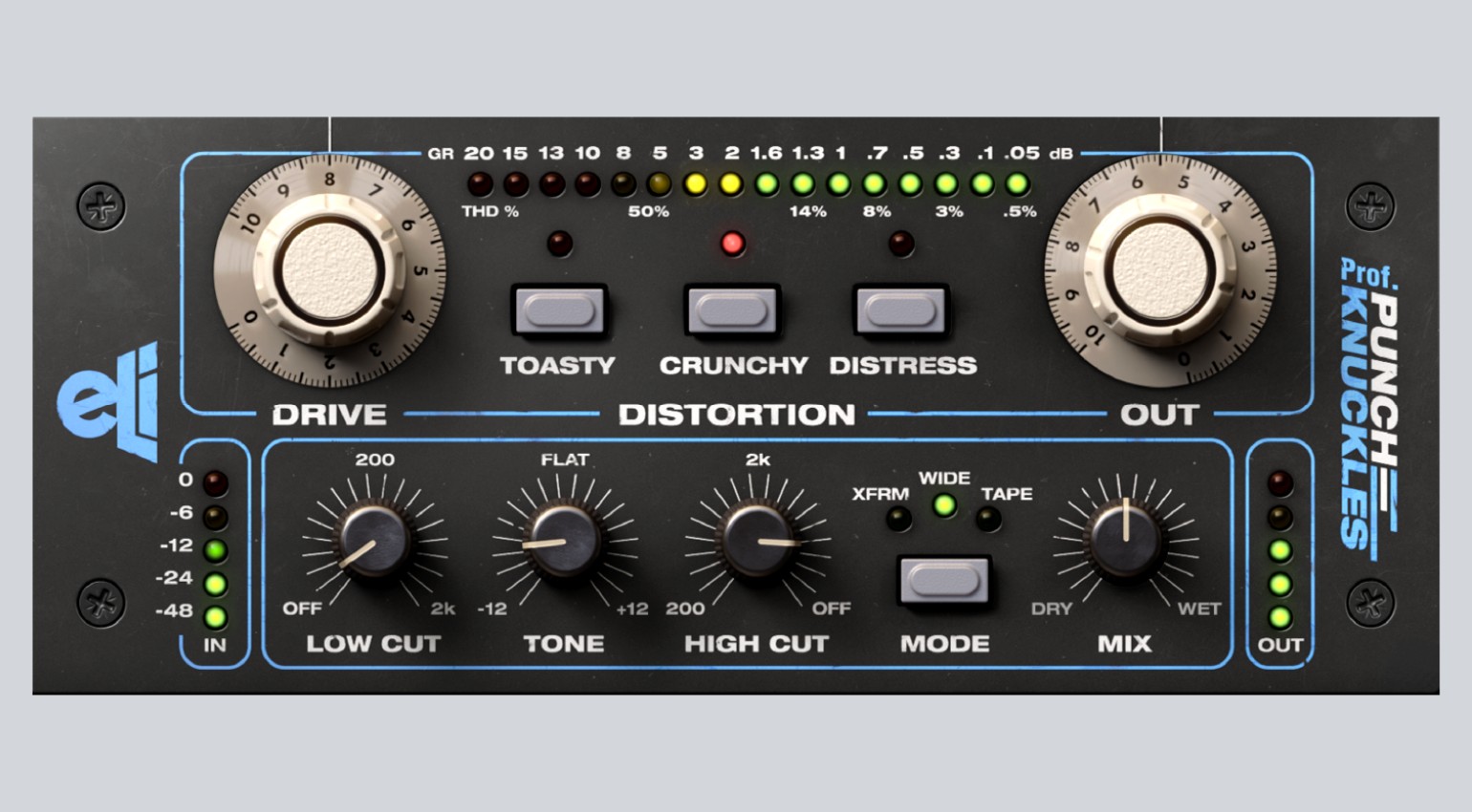 Professor Punch Knuckles provides three distinctive saturation modes, including Toasty, Crunchy, and Distress. While the Toasty and Crunchy modes are modelled on the preamp circuit from the Mike-E channel strip, the Distress mode comes from the Distressor’s compression circuit.