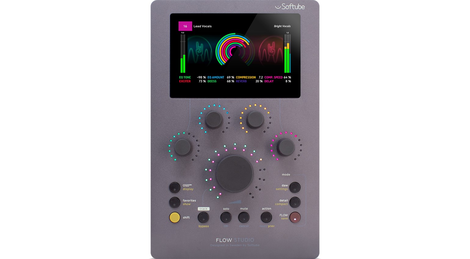 - USB-C hardware controller combined with Flow Mixing / Mastering plugin and on-screen display