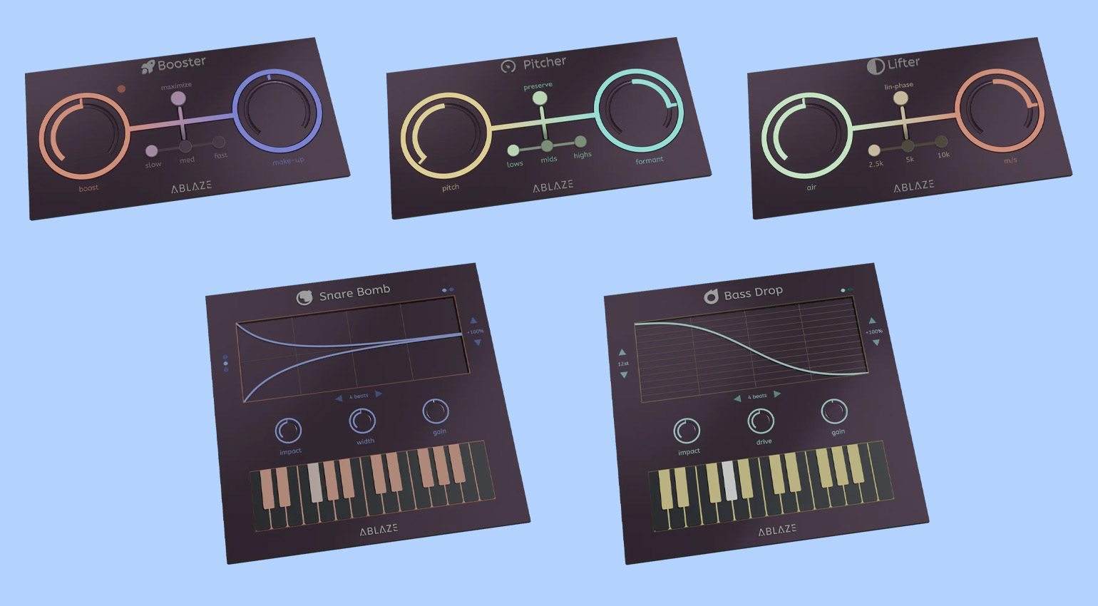 All five free plugins of the Ablaze Toolkit are available for macOS, Windows, and Linux in VST, AU, AAX, CLAP, and LV2 formats.