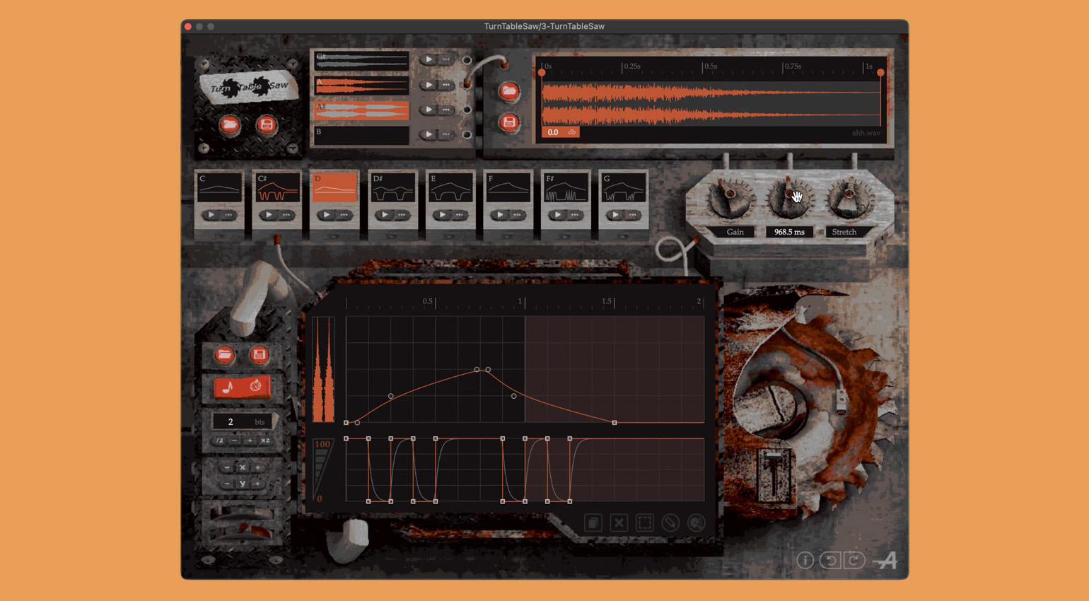 TurnTableSaw has four sample slots for importing samples of your choice via drag-and-drop. There’s also a handy editor for trimming samples to the portion you want to use for scratching.