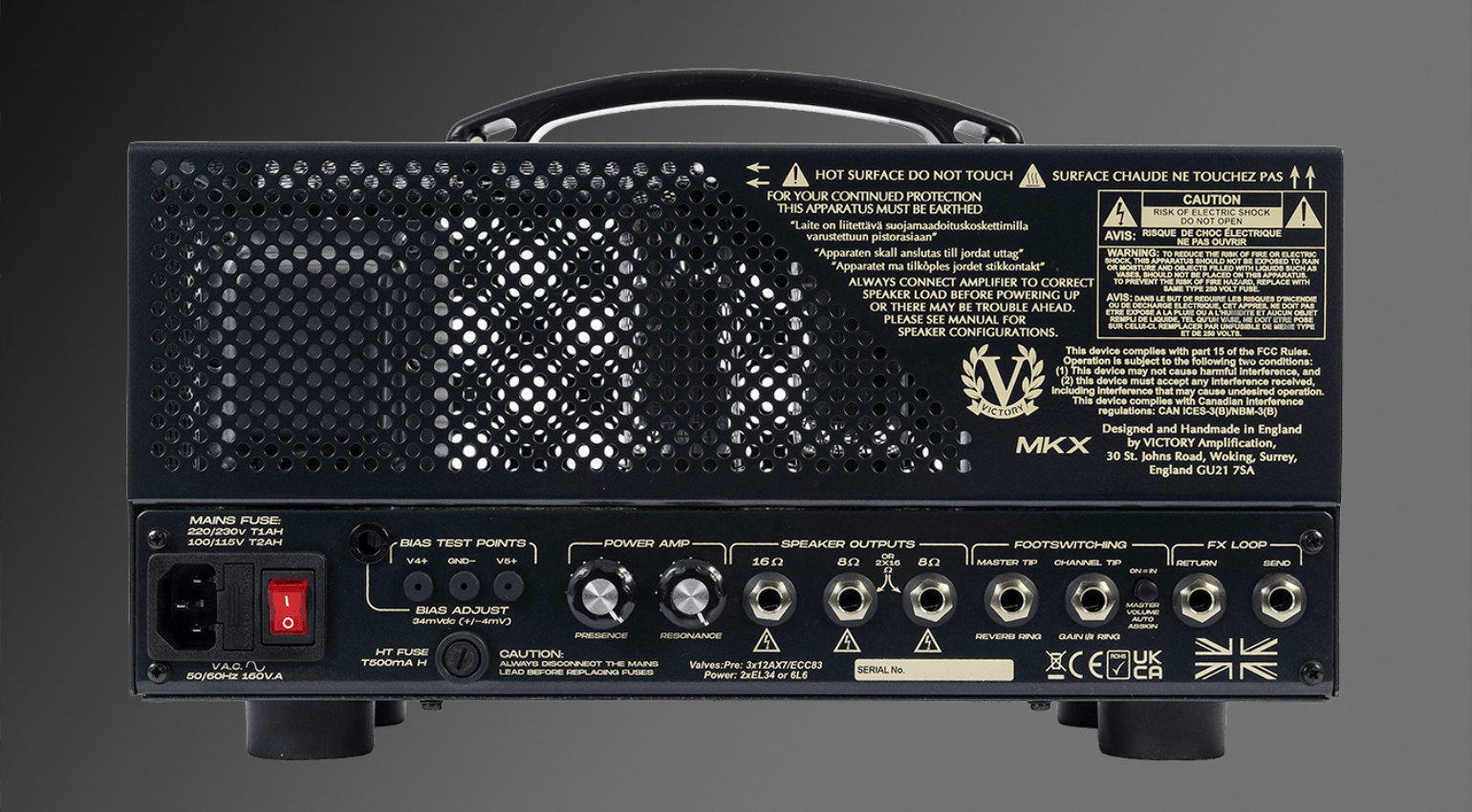 Victory Amplification MKX is closely based on the MK Overdrive. It comes with three voicings: Clean, Overdrive-1, and Overdrive-2, all with 50 watts of power. Three ECC83s are used in the preamp to provide a wide range of sounds from crunch to high gain.