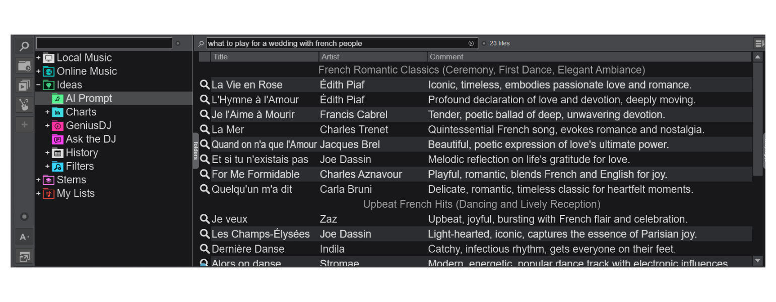 The AIPrompt Folder is a new feature in VirtualDJ 2026 that brings the power of an LLM (large language model) directly to the DJ app. It’s essentially like having ChatGPT in VirtualDJ! However, it’s only a limited version, as you only get a basic AI assistant that helps you find, describe, and create lists of recommended tracks faster. Does that sound a little creepy? Of course, you don’t have to use this feature. The descriptions shown by the manufacturer in the image seem a little strange. This feature is only available to Pro license users, by the way.