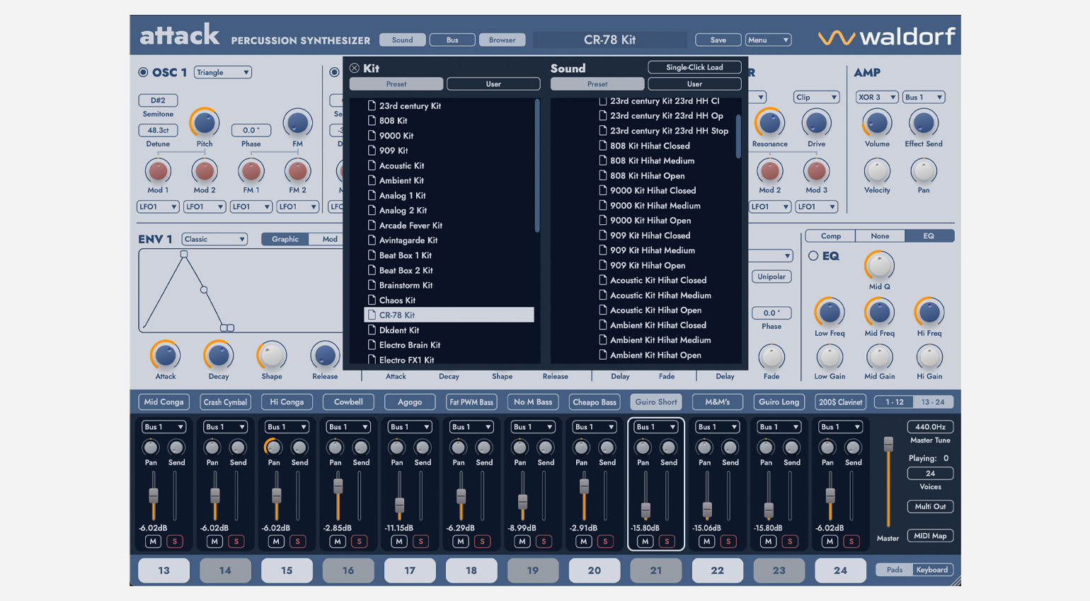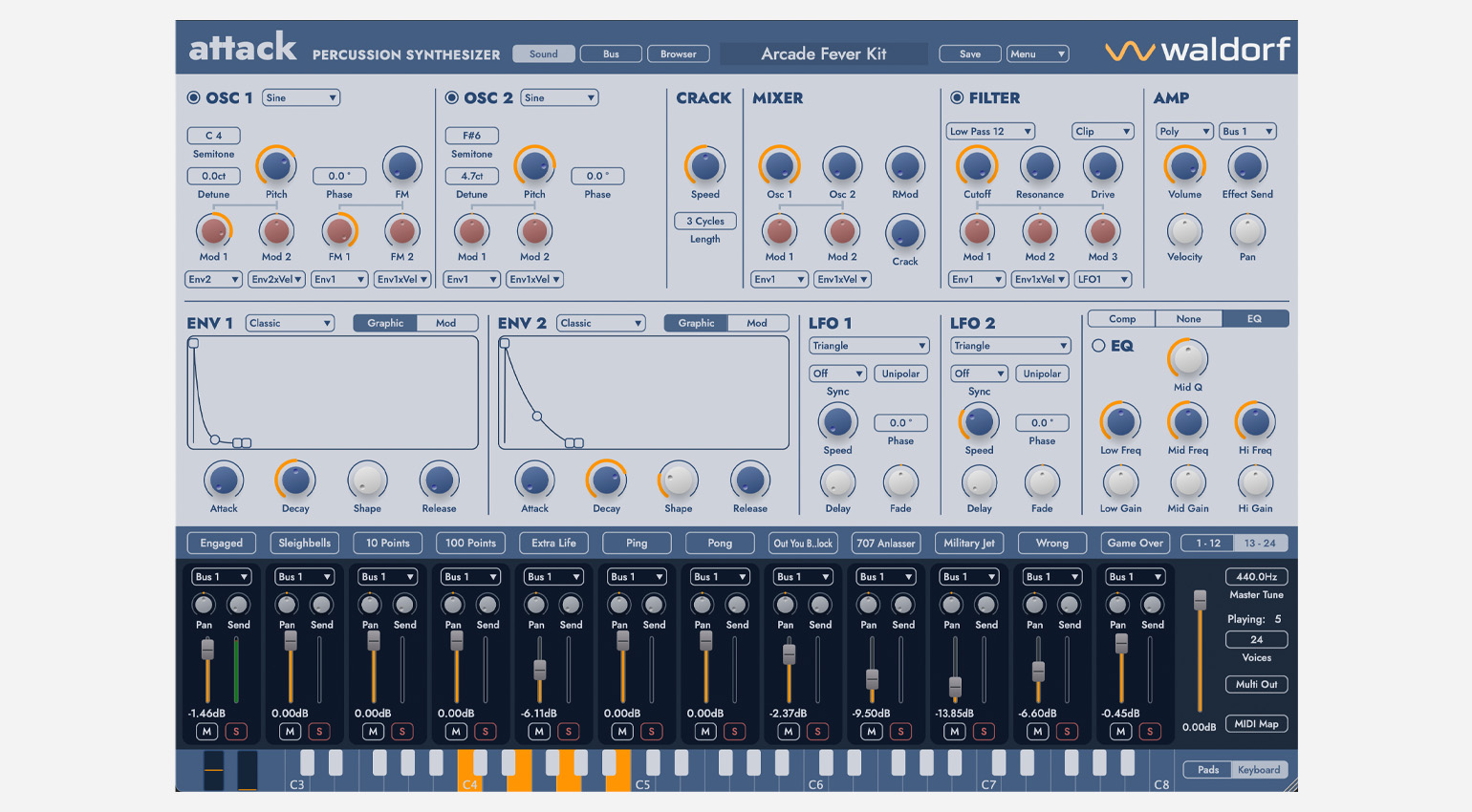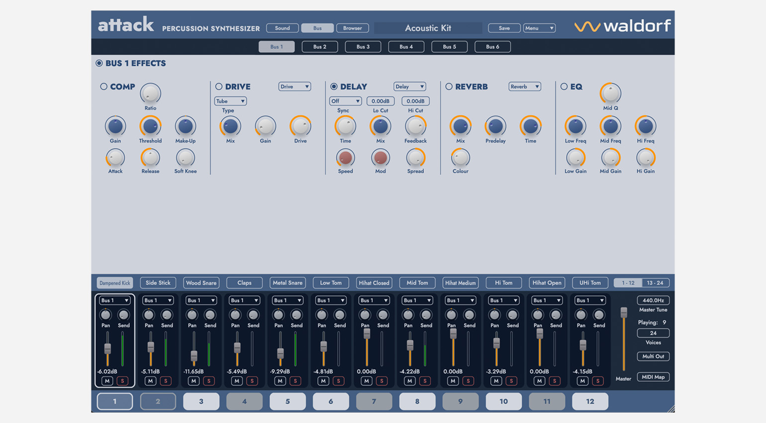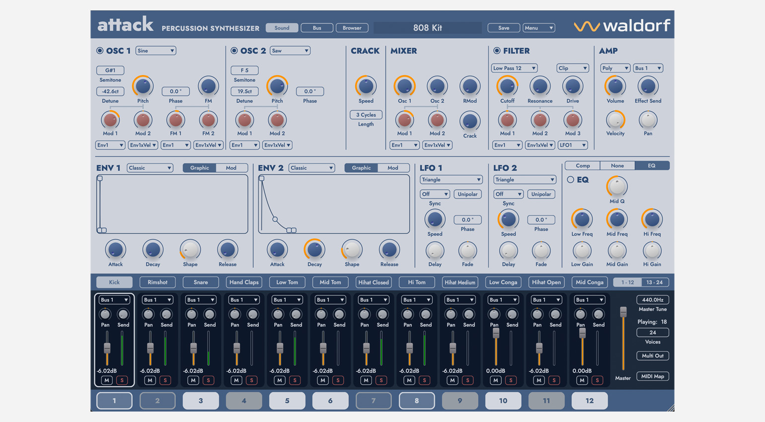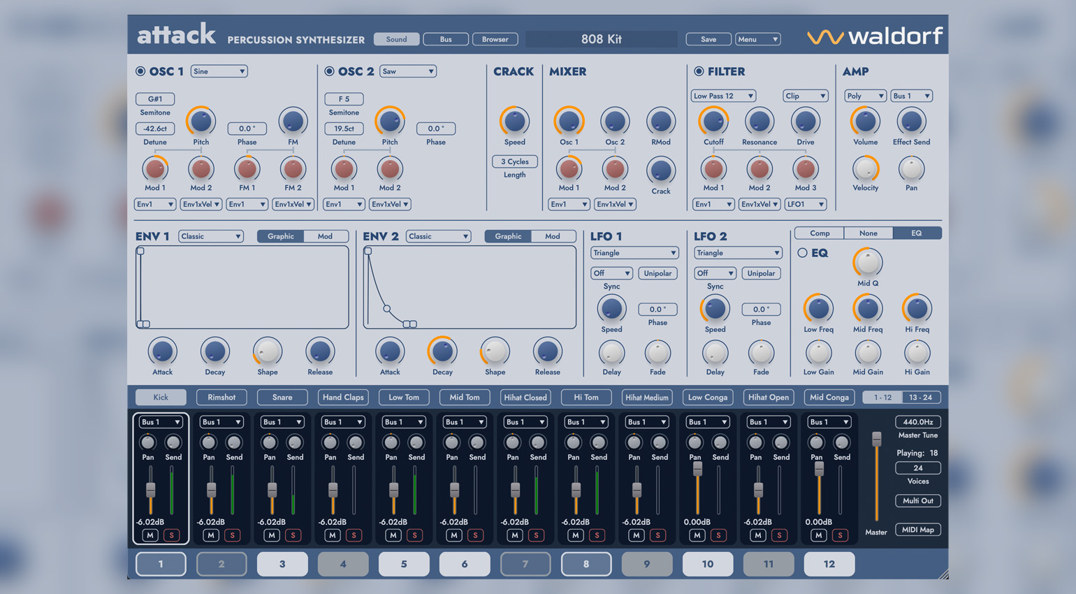 Add to this two new advanced envelopes, two fully-featured LFOs, expanded modulation routing and new effects. Attack 3 gives you 24 individual sounds per kit, with 12 of them playable polyphonically as pitched instruments. Each sound has insert effects, plus a range of global effects to help you shape your sound, your way.